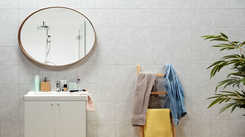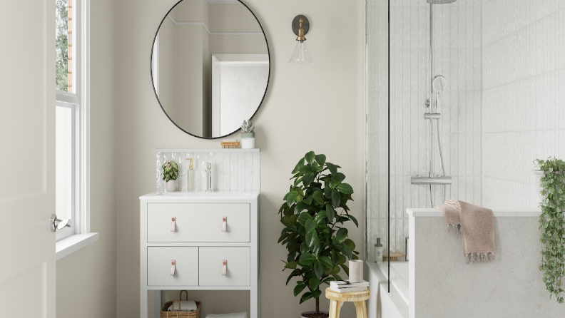 Large mirrors are an excellent decorating trick for bathrooms, creating the illusion of extra space. They reflect ambient and direct light, so a clever placement would be next to a light source to give your room extra brightness.