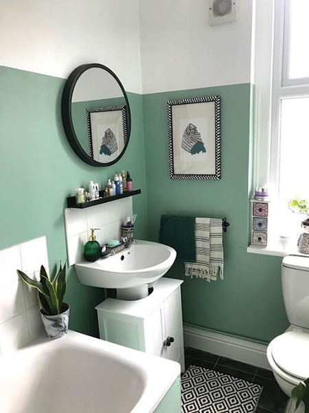 Pairing dark and light shades of your favourite colour can work wonders for your bathroom. Whether trying this technique with vibrant hues or warm neutrals, we recommend using the darker colour in the lower areas of your bathroom. Then, contrast it with a lighter colour on the upper walls, creating a brightening two-tone effect.