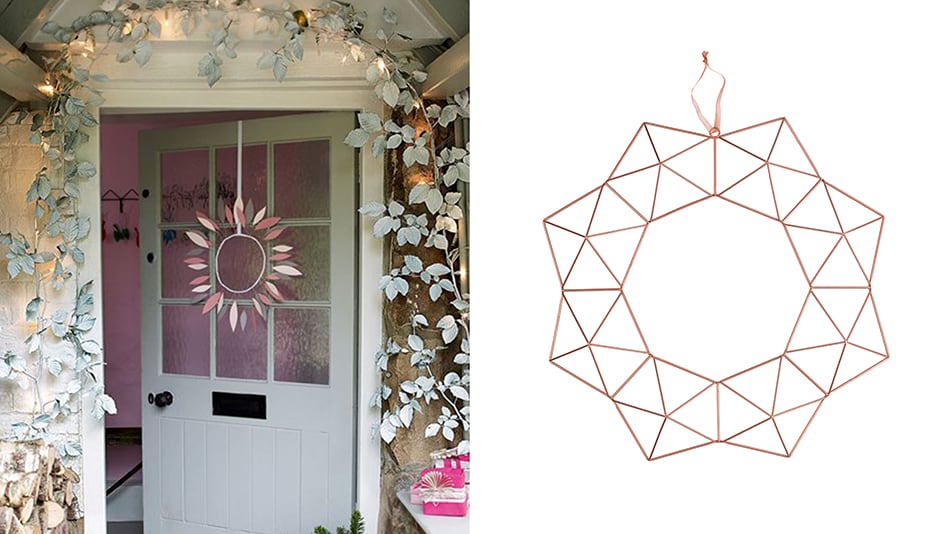This fairytale-like entrance comes courtesy of House and Home). To turn an all-white porch and front door into something magical, play around with adding a few faux leaves painted in whites and pinks and it’s a happily ever after. Alternatively, use your white front door to go graphic and contemporary with a geometric wire wreath, like this metallic one from TK Maxx.