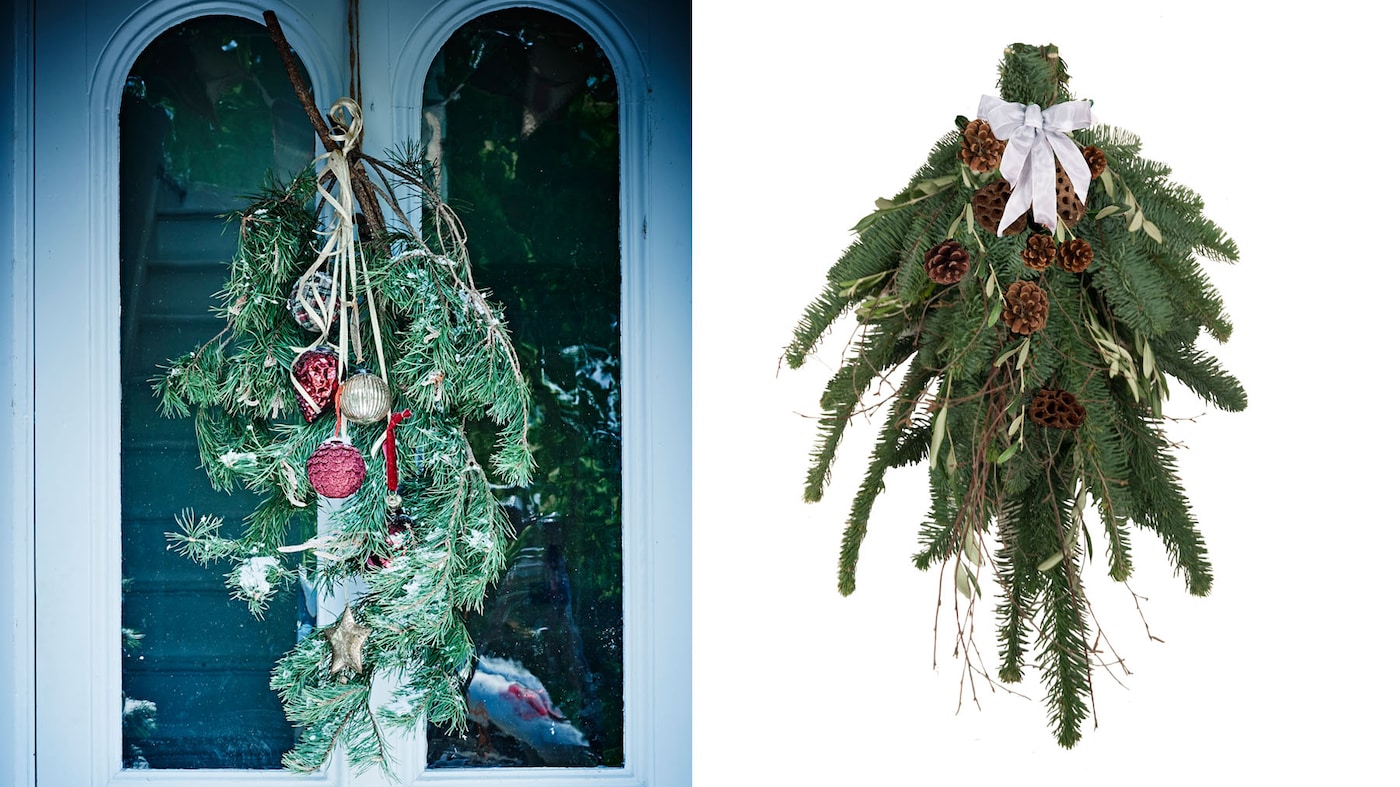 Though to keep a traditional Christmas approach to your wreath, but with a twist, have an evergreen bundle of foliage on your front entrance like Sainsbury's (left).