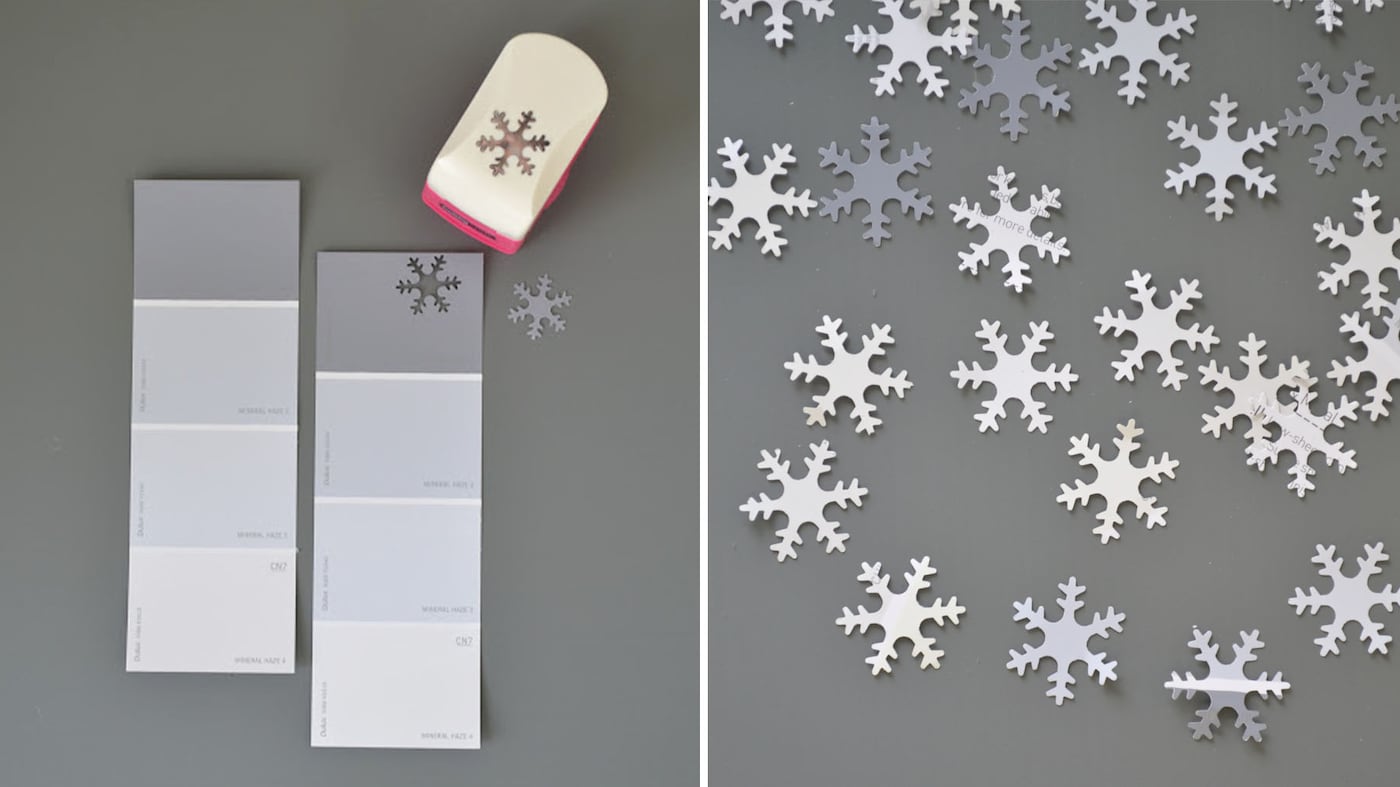 A snowflake punch and swatch cards in shades of grey is all it takes to create perfectly icicle shaped confetti. Sprinkle around the house/ Along the Christmas table/ In your cards for the full winter wonderland effect.