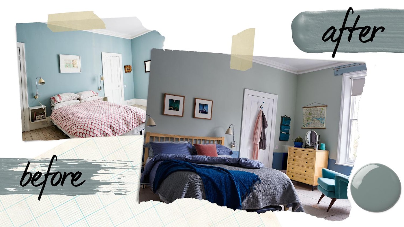 Paul's new look bedroom uses a scheme of blues and earthy shades combined with a two-tone effect on his walls. 'This technique is really easy to do and is a really simple way to add depth to any room.