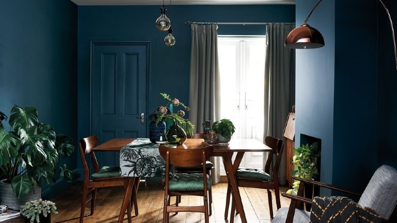 Painting all the walls in a deep hue like Sapphire Splendour or Everglade Forest provides the perfect backdrop for dark wooden furniture. Then introduce metallic accents, mirrors, soft lighting and textures like velvet or boucle to lift the space and add dimension.”