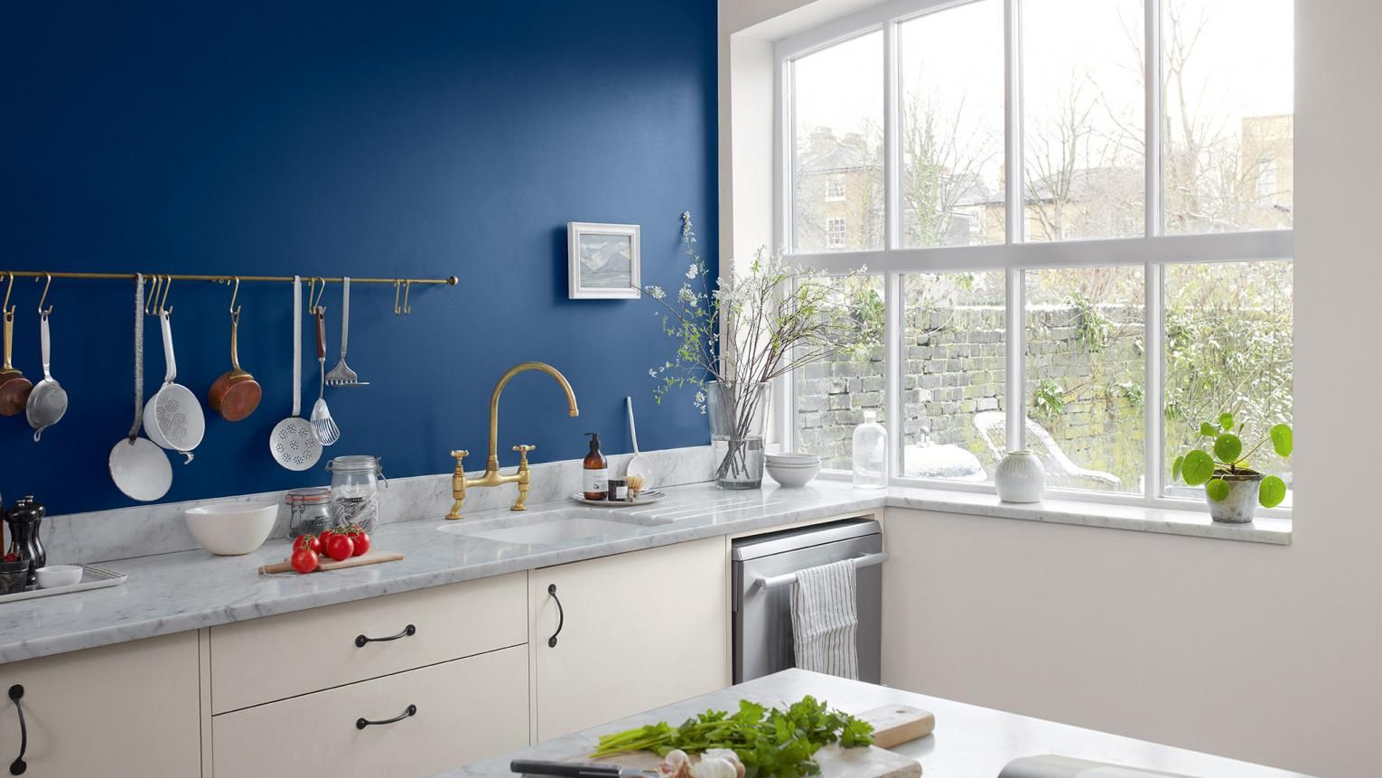 Dark blue walls in a kitchen are bold and contemporary, and they’re also incredibly versatile when it comes to adding fittings and furniture. In a kitchen with dark blue walls, you can choose between dark cabinetry or contrasting light cabinetry. White cabinets are the best option for smaller blue kitchens as they add lightness and brightness, creating the illusion of space. Crisp, clean cabinets also look elegant and modern alongside dark blue walls. Copper or gold pipes and fittings can bring a hint of vintage chic to a modern space.