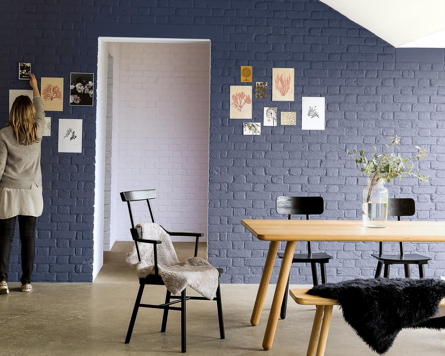 Transform tired brick walls by painting them with a dark blue paint like Sapphire Salute. Hang framed pictures to break up the block colour and add Scandi-style wooden furniture to complete the look.