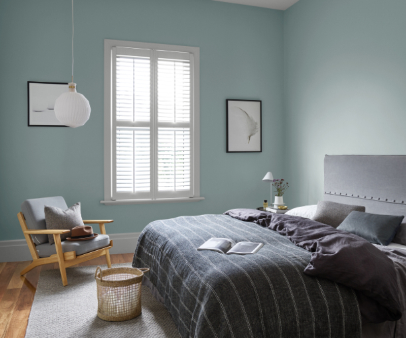 For a country-inspired blue and white bedroom, paint the walls in a pale blue like Mineral Mist and add white wooden shutters. Then, introduce natural wooden accents like an armchair, photo frames, and reclaimed timber shelving. Wicker storage baskets and crisp linen bedding will add even more texture and enhance the rustic feel.
