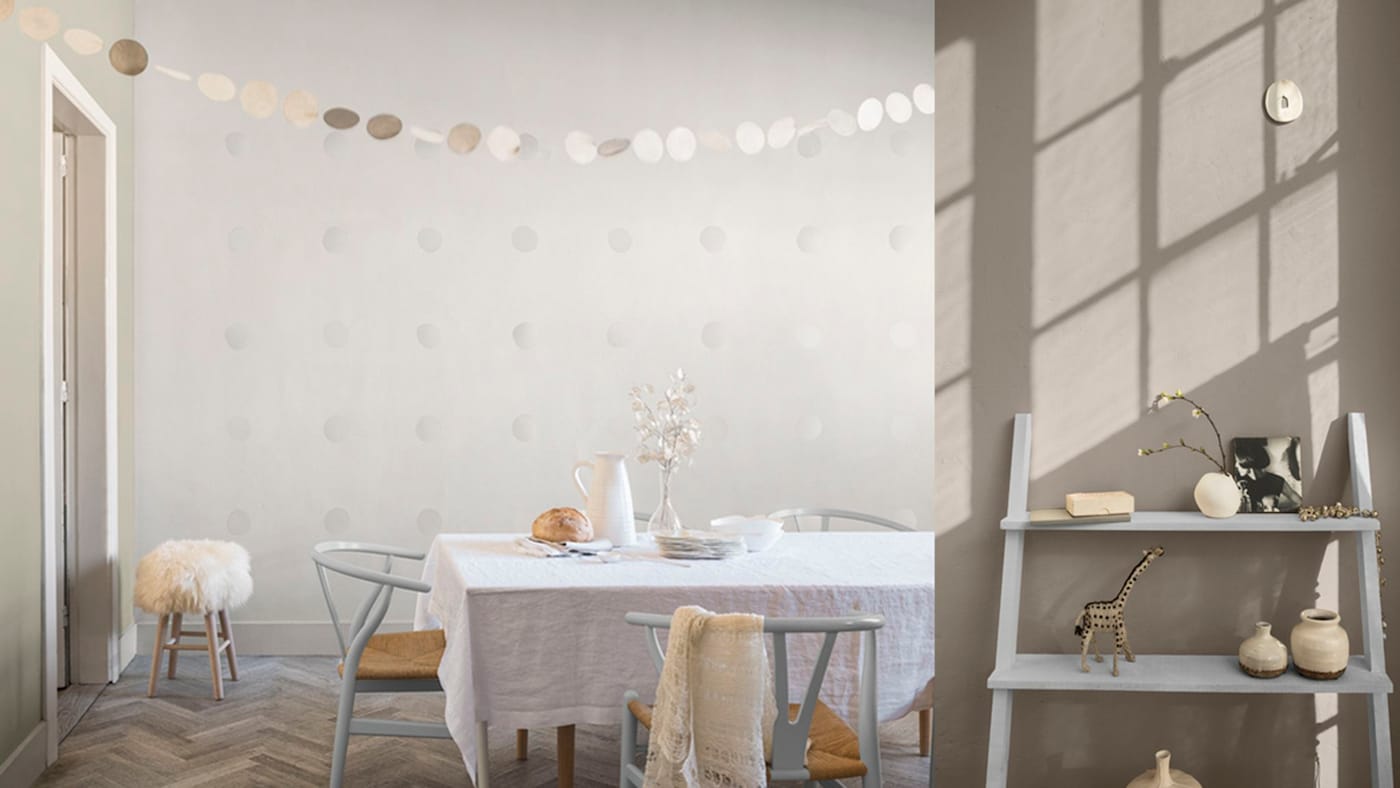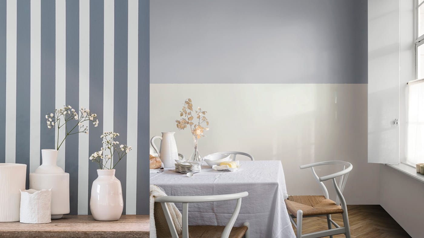 “Broad horizontal wall stripes make a room feel more spacious. When painting stripes, always use the lighter colour as the base and allow to dry. Then measure and tape the walls before painting the darker colour. The trend of turning away from the material to focus more on sensory experiences is gathering momentum. This pared-back palette truly reflects this new focus. To test these colours in your home, you can order a wet tester by clicking on the colour swatches below.”