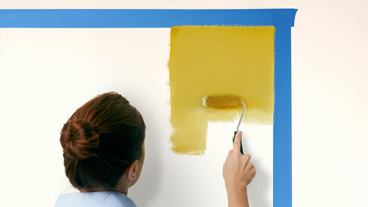 Using a small roller and tray, roll paint to fill the shape of your headboard, being careful not to roll over the outer edges of the masking tape.