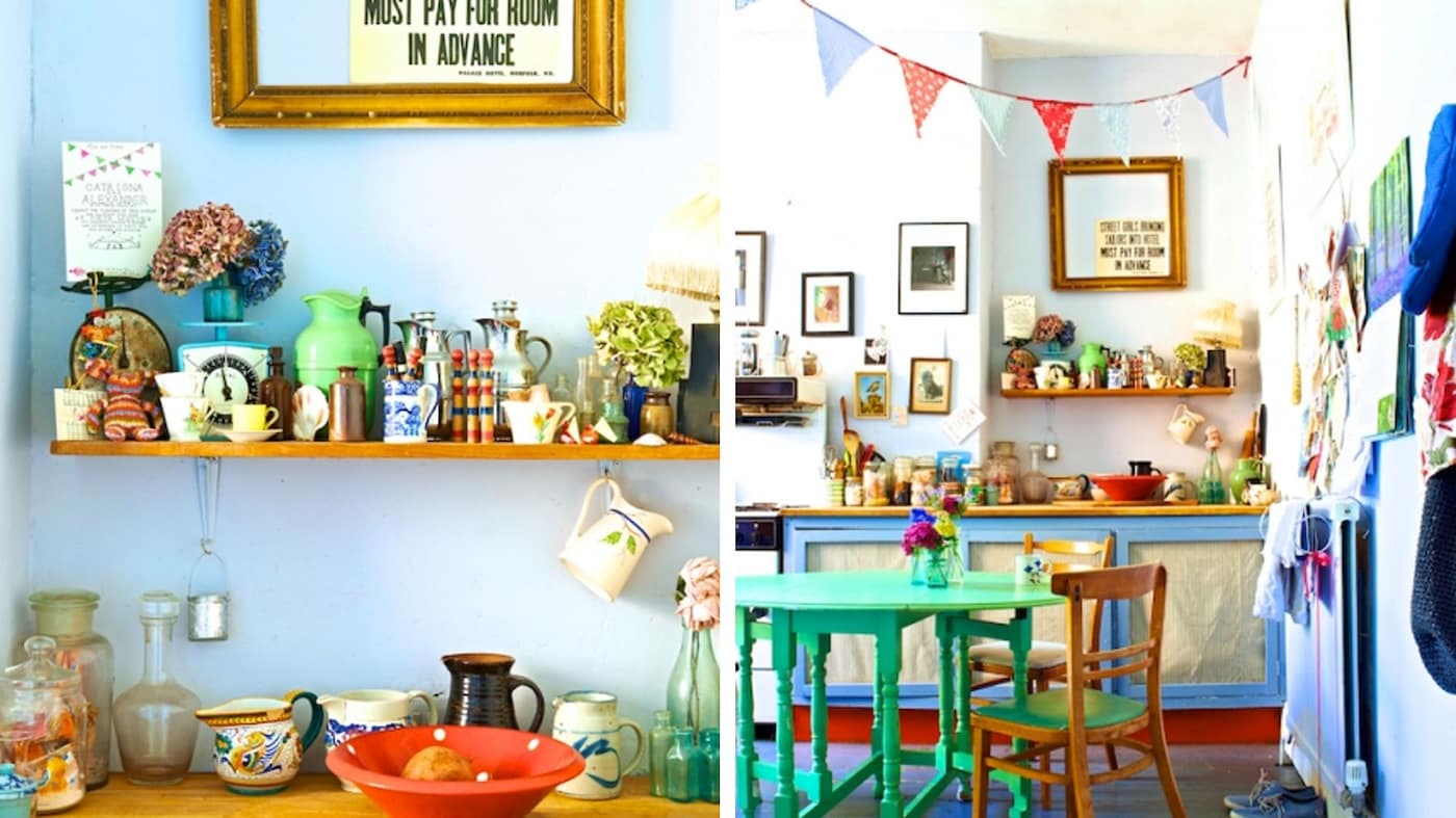 The kitchen has a quintessentially vintage vibe, thanks to painted cabinets in blue and red, a kitchen table in an evocative 1950s-green and cheerful fabric bunting strung up around the room.