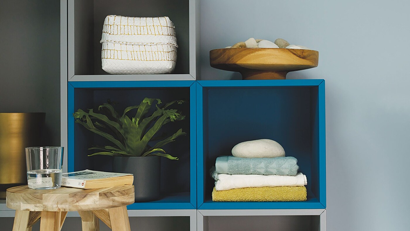Decide how you’ll arrange the boxes on your wall, then paint them in varying shades that pick up accents in your room. Dulux Quick Dry water-based paint is hardwearing and washable, making it perfect for this job. Once painted, screw the boxes to the wall and wave goodbye to unnecessary bathroom clutter.