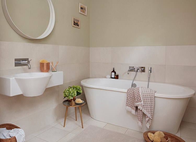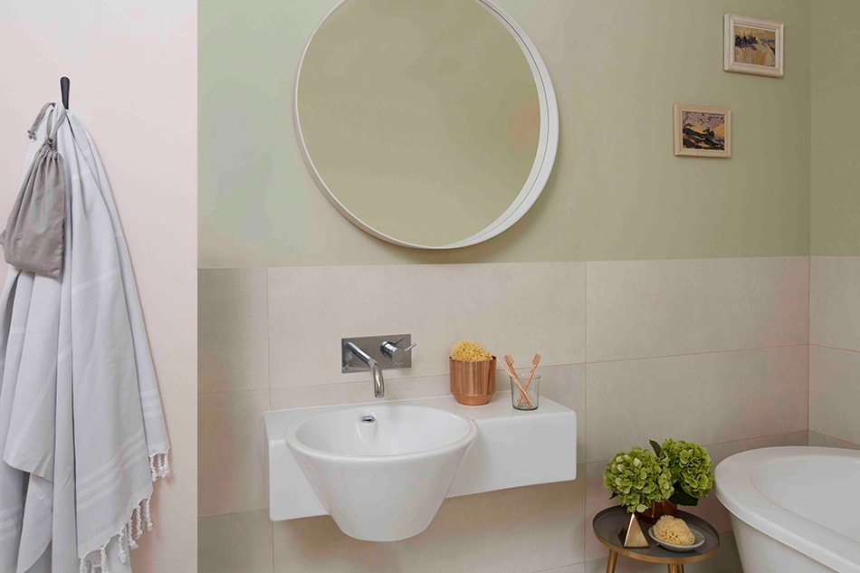 This pale Mossy Stone, in moisture-resistant Easycare Bathroom, reflects light, opening up the space, while its restful green undertones create a calming mood.
