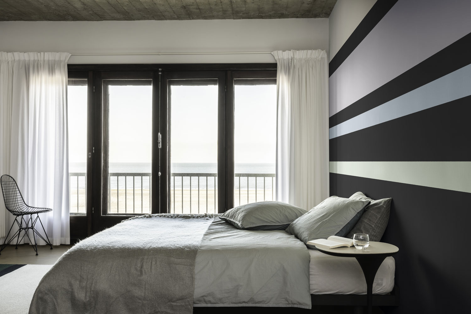 For a black and grey bedroom idea with a playful and unique twist, turn to stripes. Start by painting black horizontal stripes of varying thickness in a paint like Idaman Grey, then fill in the gaps with soft pastel accent colour like a mint green, a subtle lilac and a soft sky blue.