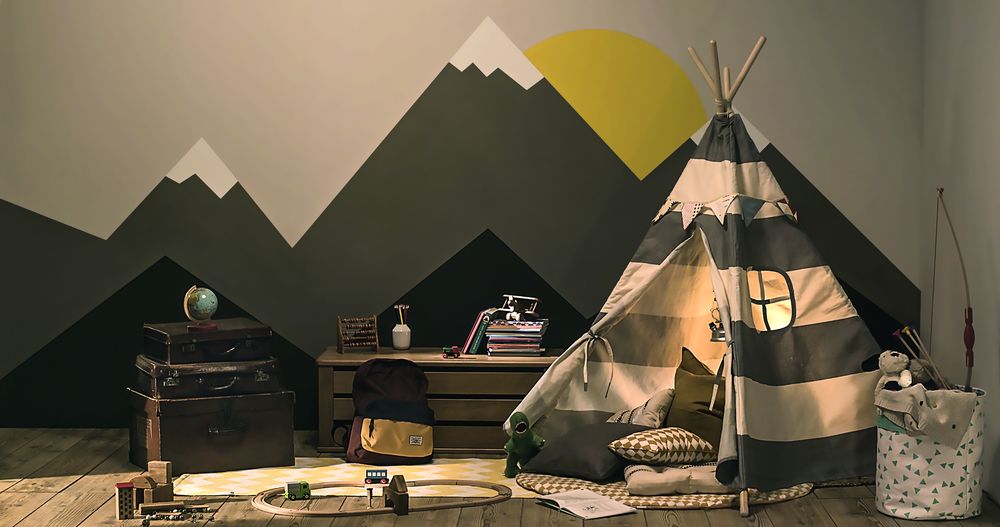 Coat the walls in a light grey paint like the appropriately named Skyline, then use a darker grey like Light’s Out for the mountains, a white for the snowy peaks and a yellow for the sunshine. Furnish the room with adventure-inspired items like a teepee for your little one to play in, a wooden chest for storage and a globe to help them plan their future expeditions.