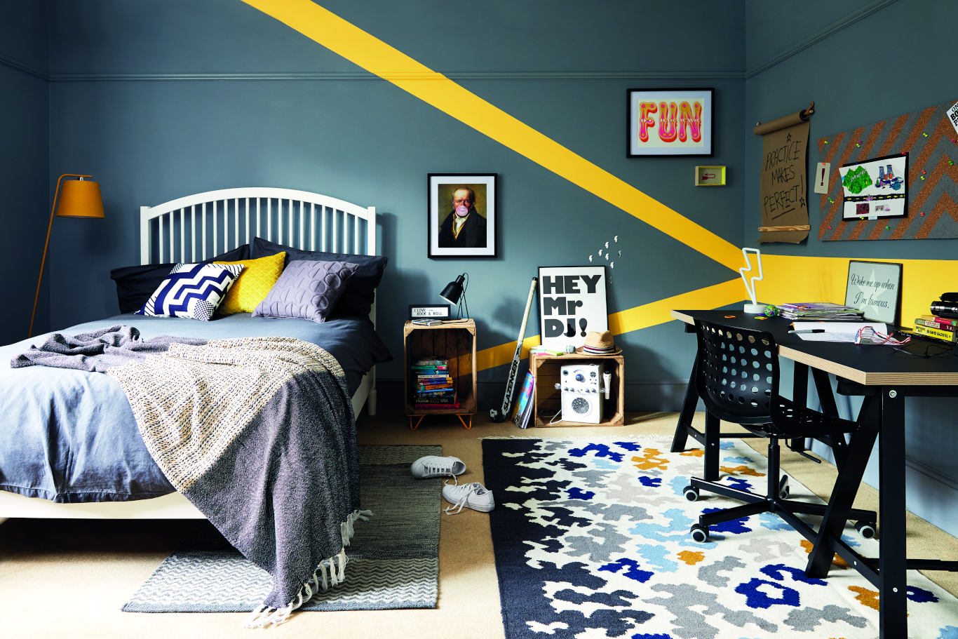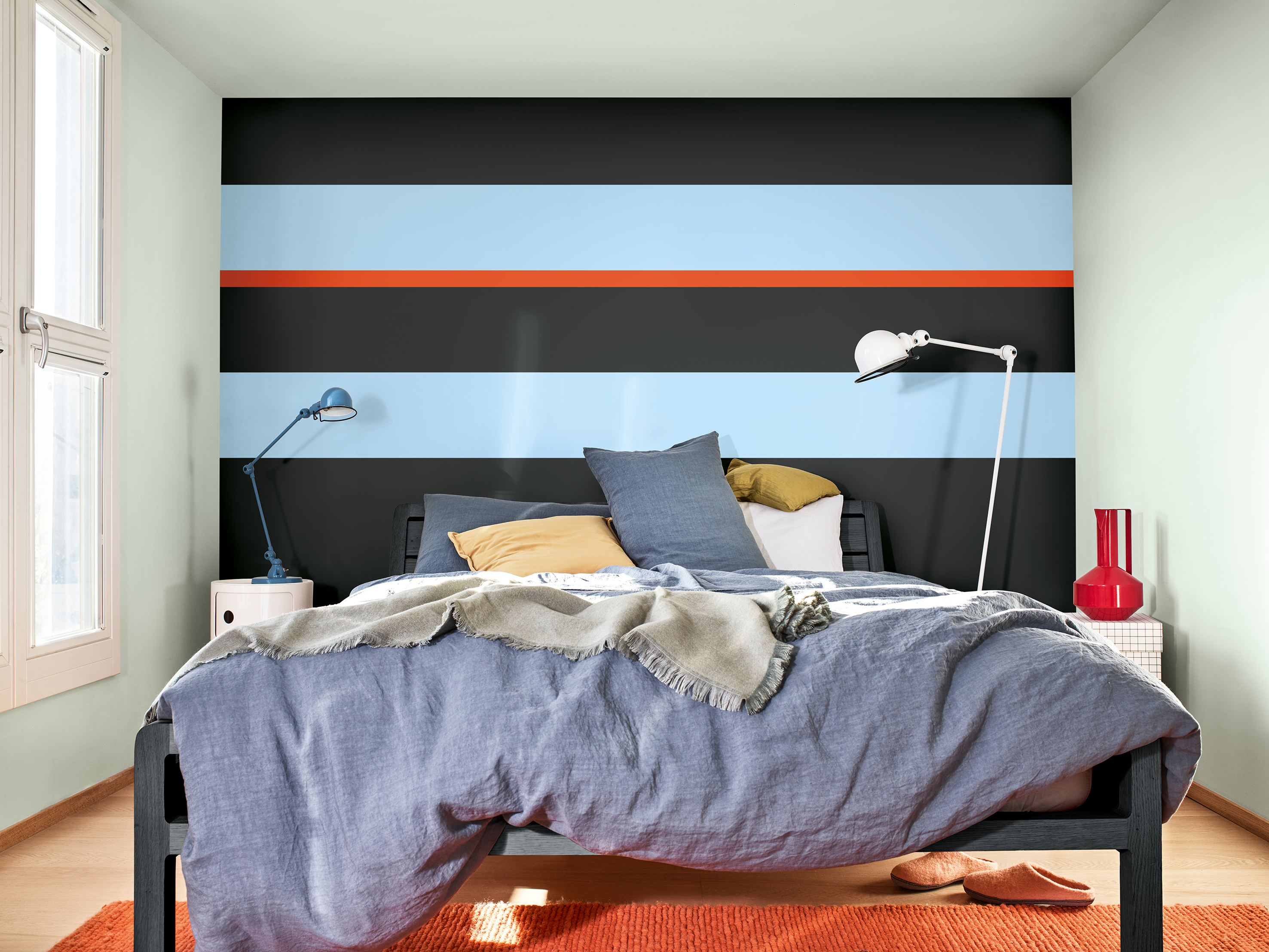 Whether you’re decorating a teenager’s room or looking for a fun and playful decorating scheme for your home office, a stripey blue feature wall is a brilliant idea. Make an impact and paint thick stripes of First Dawn and Breton Blue, with an added bold zing of contrasting colour, like the orange stripe in this bedroom.