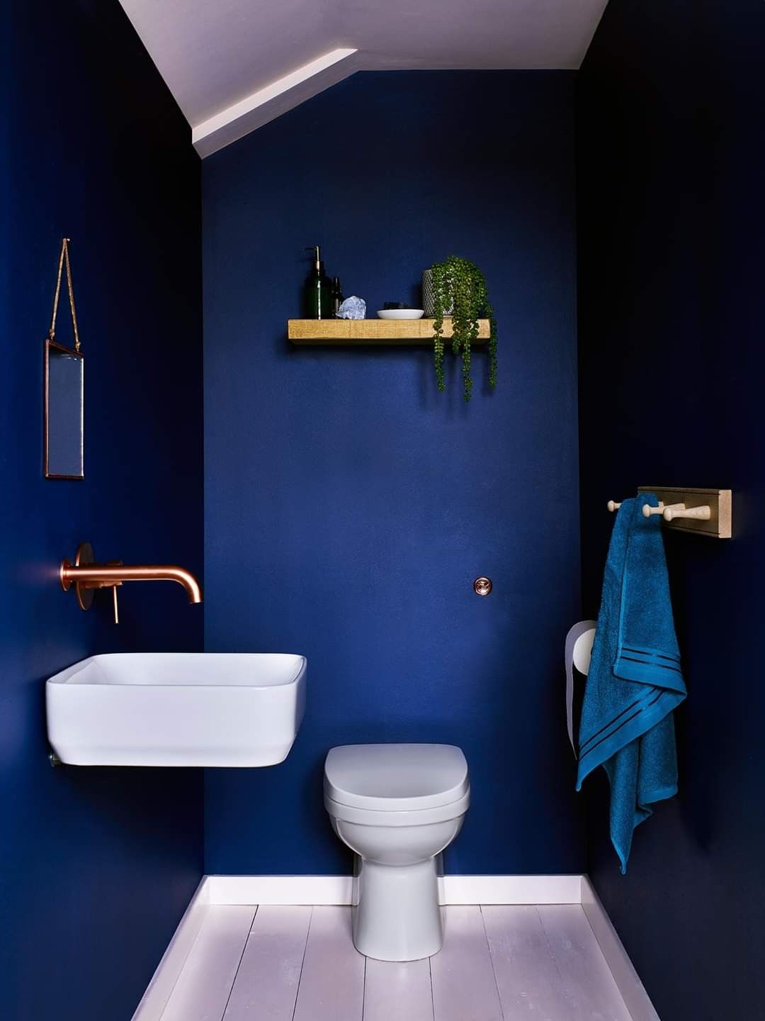 Paint the ceiling and floor white to for a touch of brightness that looks clean and coherent alongside your white sanitaryware, then add gold accents for the final flourish. Gold taps, a gold flush and a gold-framed mirror will stand out against the dark blue and create an ambience that is well and truly fit for royalty.