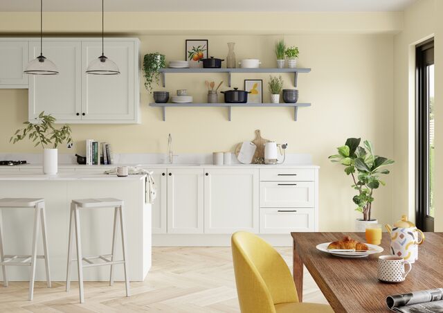 - Butter yellow. This on-trend shade is the ideal alternative to cream, bringing even more warmth to your space while keeping the palette bright. It’s perfect for small kitchens with limited natural light, making them feel more spacious. Wild Primrose is a popular butter yellow paint colour – for good reason!
