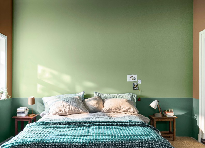 If you’re looking to go green, consider a lighter shade such as Tranquil Dawn for your walls, coupled with darker shades such as Emerald Glade for accents or feature walls.