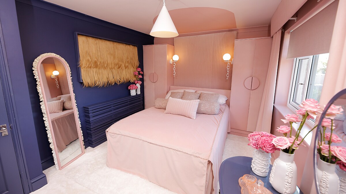 The Dulux expert’s take: What would our Creative Director, Marianne Shillingford, do? “Bedrooms are a place of sanctuary and restfulness, where we spend a lot of our time staring into the space above us… so why not use this to full effect and create a feature on the ceiling? The curved horseshoe canopy above the bed in Russell and Jordan’s bedroom makeover is a great example of this. If painting the ceiling is a step too far, you could still create a feature around your bedhead as a very effective alternative. Use your favourite shade in a geometric or curved shape to add a bit of something to your sleep space. For something moody and restful, we love darker shades such as Decadent Damson or Acai Berry. Alternatively, for something more cheery to give you a morning boost try Golden Sands.”