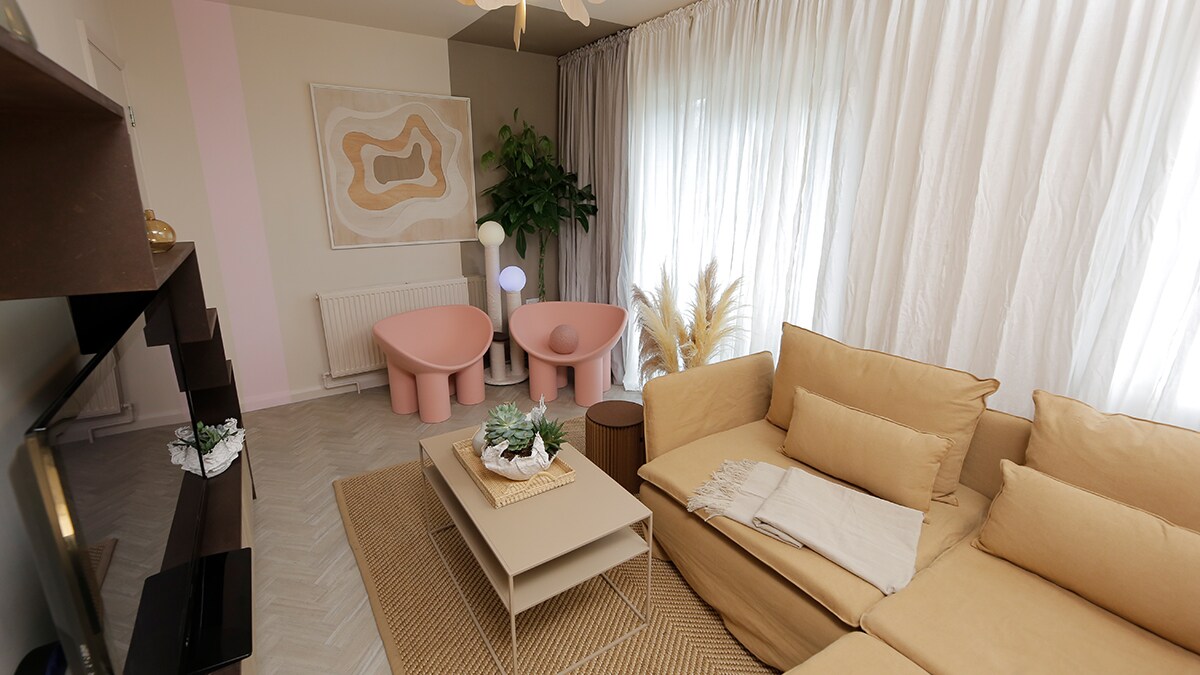 Jordan and Russell’s vision: A stylish Kardashian-infused Los Angeles look (with a little dash of Catwoman). This translated to a warm but airy space, punctuated with notes of pink and a swirly, dark beige paint effect that trails up the wall and on to the ceiling.