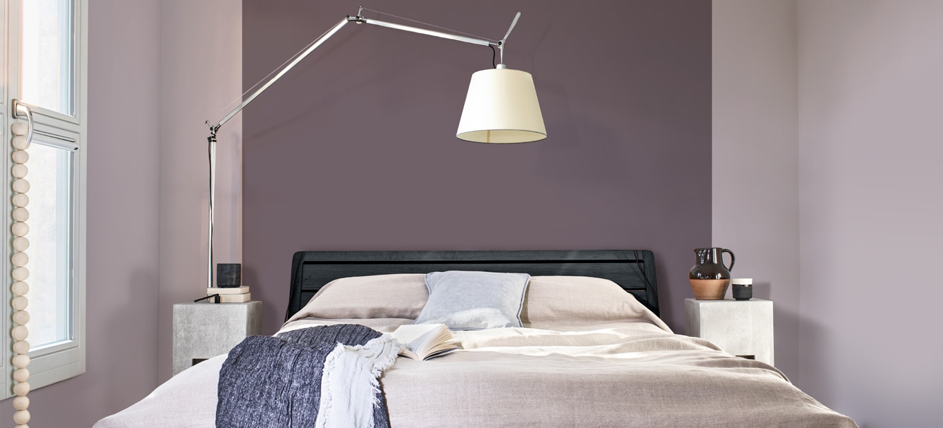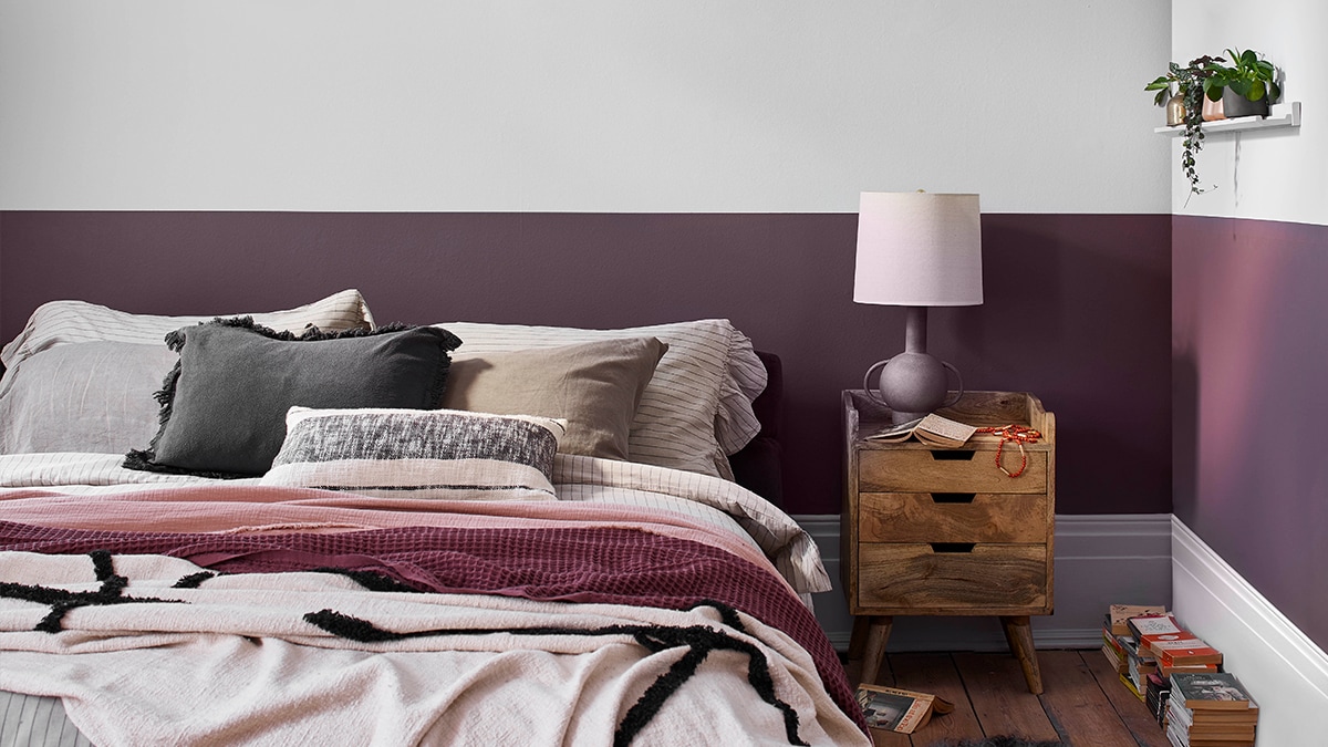 Lean into soft, toning colours with a rich undertone such as warm pinks and purples. These hues look inviting no matter how much natural light the room has – in the morning they’ll appear fresh and uplifting, whilst at night they’ll look warm and bring an enveloping sense of calm, setting the mood for snoozing. Acai Berry, Satin Bow and Dusted Fondant are all favourites.