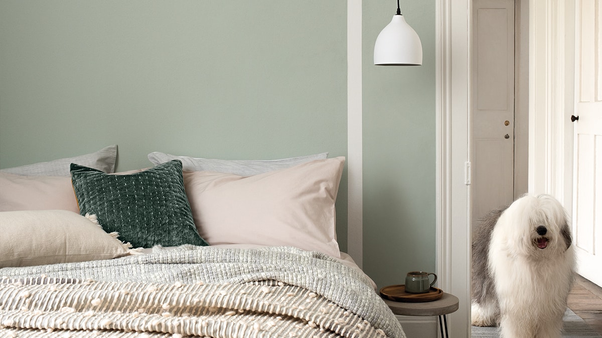 Invite earthy, grounding shades into your bedroom for a scheme that feels calming. Green is still trending and when paired with dusty shades it works perfectly for a sleep space. Sage green and celadon-like jade hues are soft and muted, and combine comfort with restfulness. Try Tranquil Dawn or Overtly Olive next to Soft Stone or Natural Hessian.