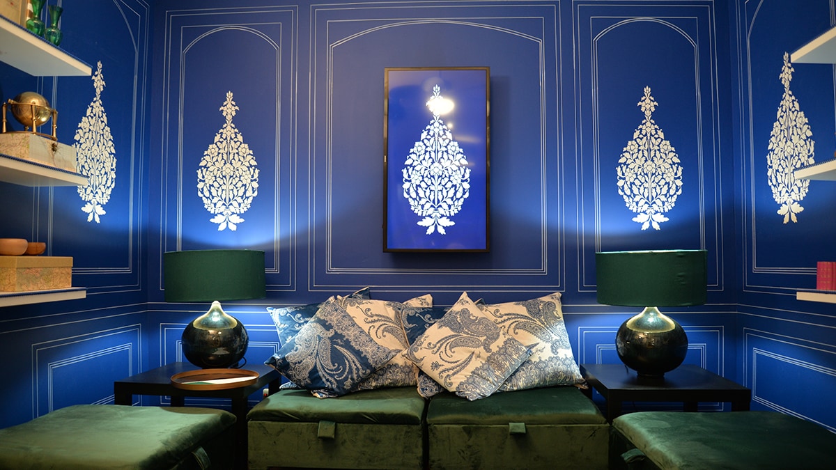 In Chris and Hannah’s living room (above), the stencilled wall art was created with a striking combo of Pen Friend blue and Pure Brilliant White, though you can choose any shade that goes with your existing scheme. We went for the gorgeous grey-like Denim Drift blue.