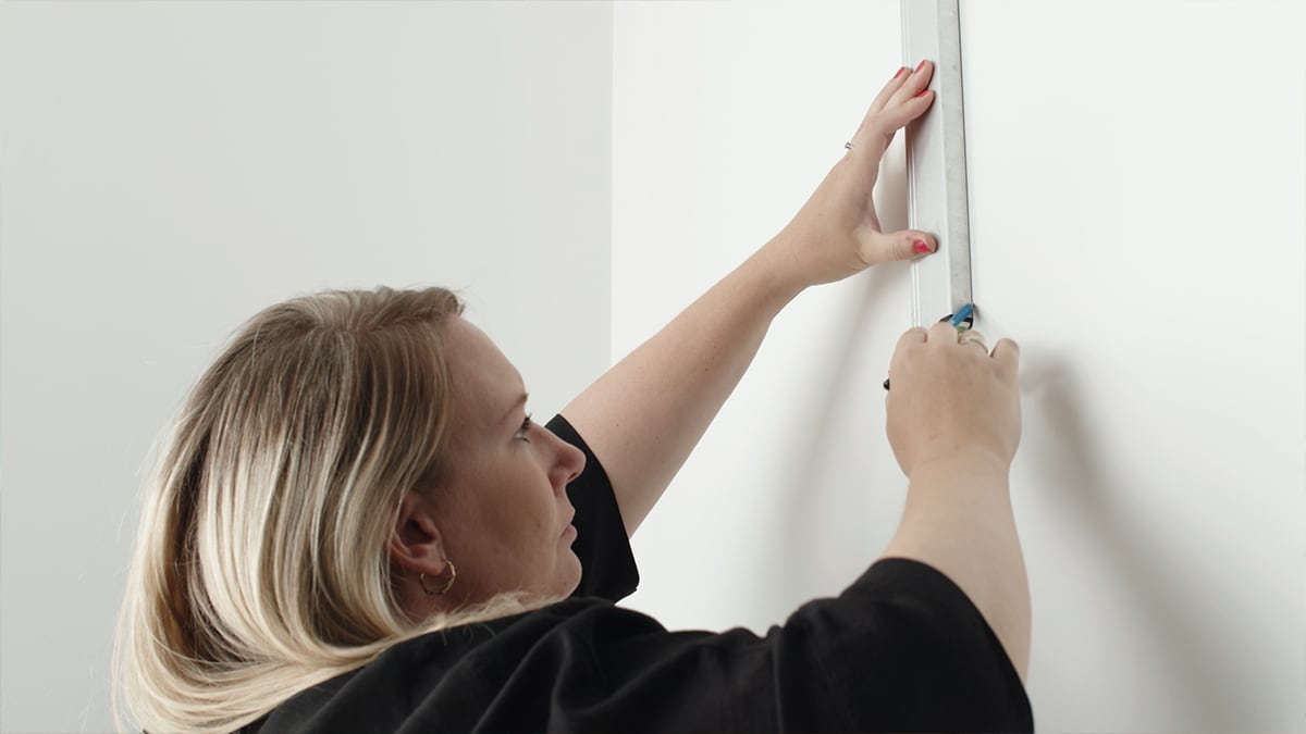 1. Using a pencil and spirit level, mark a line down the centre of the walls on each side of the corner, from top to bottom.