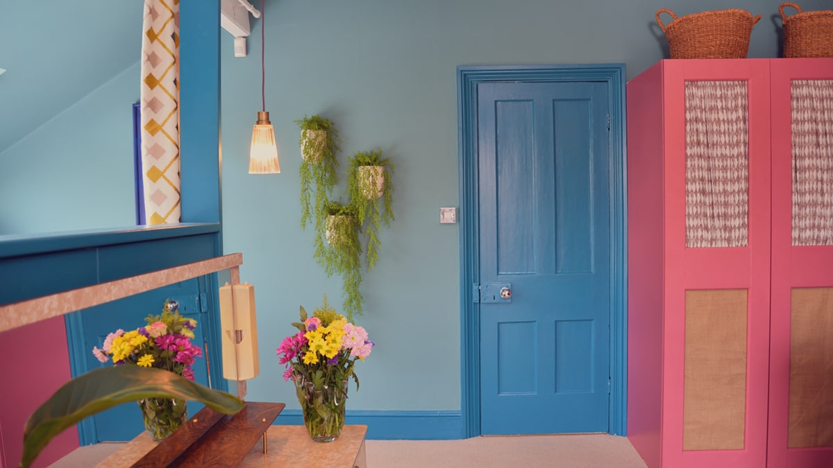 In this week’s episode of Changing Rooms, designer Micaela Sharp did just that, adding personal handmade touches to Lois and Nick’s tropical forest-themed bedroom (above). The star of the show was a striking feature wardrobe, upcycled with paint in a deliciously decadent rosy colour – Raspberry Diva, which really pops against the walls painted in Heritage Maritime Teal and woodwork in Teal Tension.