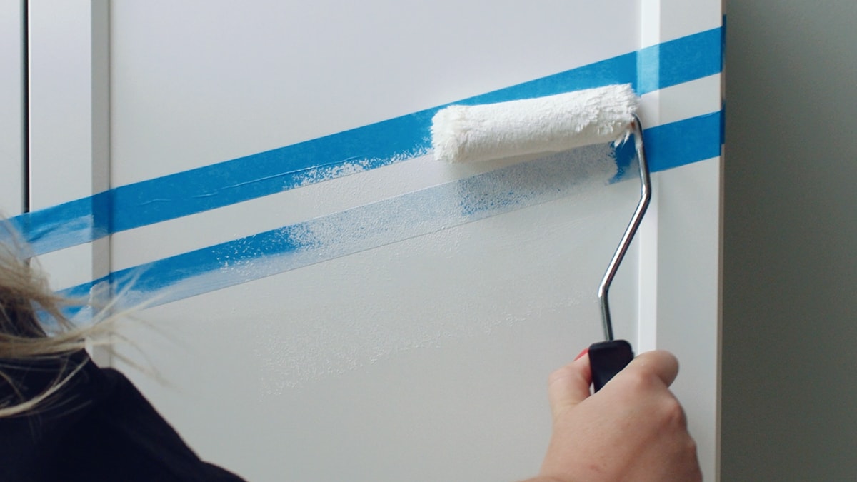 5. Apply one coat of the primer using a roller, ensuring it is evenly distributed across the cabinet. Use the roller for larger surface areas, but a paintbrush for the corners and around the handles. Ensure you paint over the masking tape for a clean, crisp line. Leave to dry.
