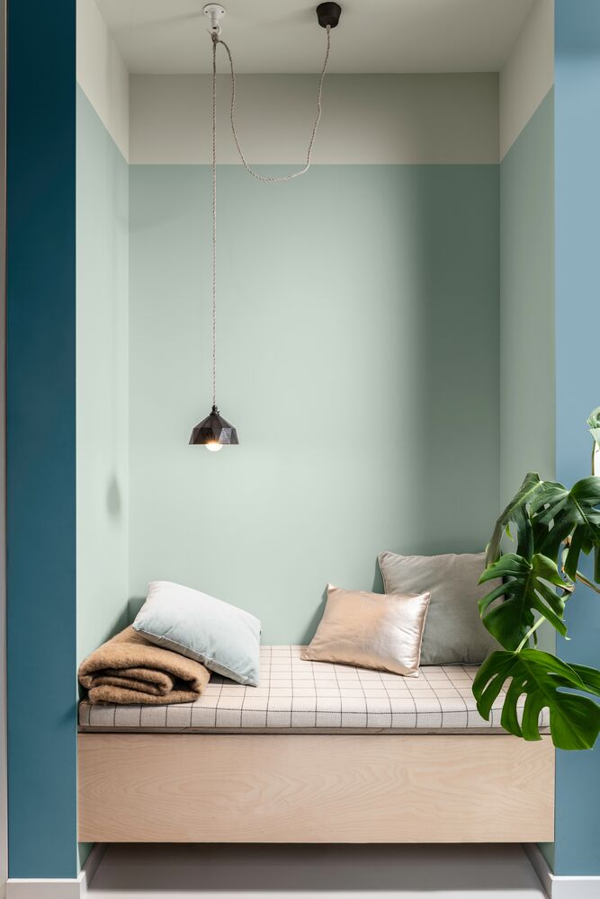 Bring the tranquillity of the sea to your bedroom or living room with relaxing teal tones like Mint Macaroon. Alternatively, create depth and cosiness in a smaller space with a powdery Mineral Mist feature wall for a calming blue bedroom. Soft furnishings in greys and warm contrasting hues work well for this dreamy look.