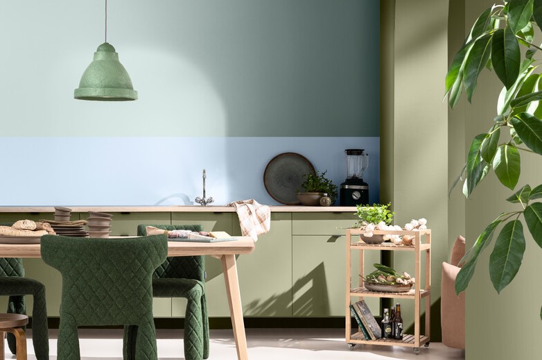 The Greenhouse palette is full of south facing room colours. In this kitchen, we teamed two greens, Fresh Foliage and Calming Meadow, with a splash of our Colour of the Year 2022, Bright SkiesTM, a light and airy blue. Together they bring the tranquillity of nature into the room, whilst making the most of the natural light that’s flooding in.
