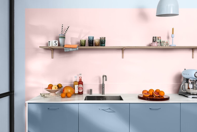 The Workshop palette is made up of bright, joyful hues, giving you a great selection of north facing room colours. Here we painted a large feature wall in Rose Canopy to make the space feel brighter, then surrounded it with Bright SkiesTM and Sky View on the kitchen cabinets.