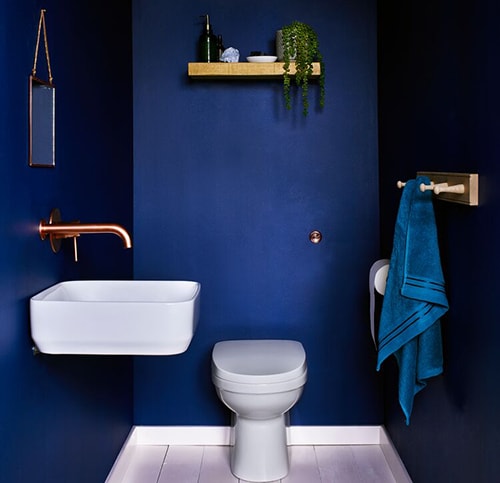 Gold and navy are a classic colour combination. For navy walls, contrast with gold accessories like vases and pots. In particular, those that have a glossy surface will reflect light back into the room and help lift a darker space.