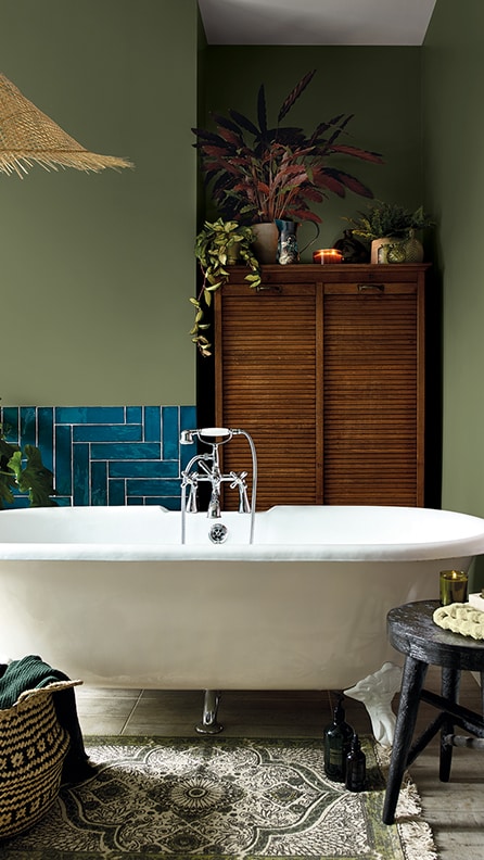 Take it upstairs and turn your bathroom into a garden oasis with natural greens. We’ve brought the outside in by painting matt Guild Green on the upper portion of the walls, offset by glossy turquoise tiles beneath, together with complementary green textiles, accessories and plants. The effect is cocooning and comforting – somewhere to retreat to.