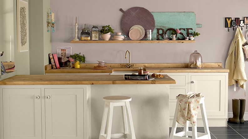 Style tip: add a simple wooden shelf against a newly-painted feature wall to display beautiful crockery, glassware, collectibles and platters – not everything needs to be concealed away in cupboards. A conversation-starter in any space.