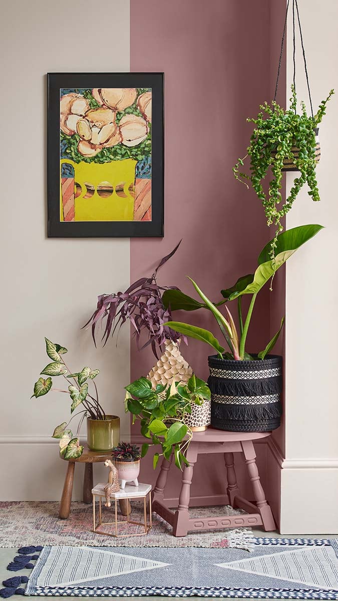 With Simply Refresh Multi-surface, the sky is the limit when it comes to your creativity, enabling you to match your woodwork and walls quickly and easily. In this corner, we’ve cosied things up by painting warm Pressed Petal™ on both the stools and a section of the skirting – all without priming first – while taking a matching stripe all the way up the wall in Simply Refresh One Coat to create a ‘drenched’ effect. A wall in neutral Timeless™ and a collection of lush green plants make the saturation of colour pop even more.
