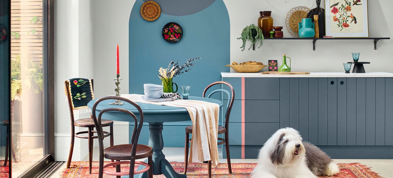 Inherited a kitchen that’s just not your style or uninspired by one you decorated ages ago? Fear not. A simple lick of paint can transform the entire space. Here, we’ve reinvigorated tired and scuffed kitchen cabinetry in deep and rich Ink Well™ with Simply Refresh Multi-surface, with no need to prime before painting. With some of your favourite colours now available as part of our new two-in-one product, we added vibrant go-faster stripes on the end of the cabinetry in Stonewashed Blue™ and Coral Charm™, extending them onto the wall in an arch shape with the addition of Coastal Grey™ and Faded Indigo. The effect is a lively backdrop for evenings around the table. Watch our helpful video to find out how to paint an arch.