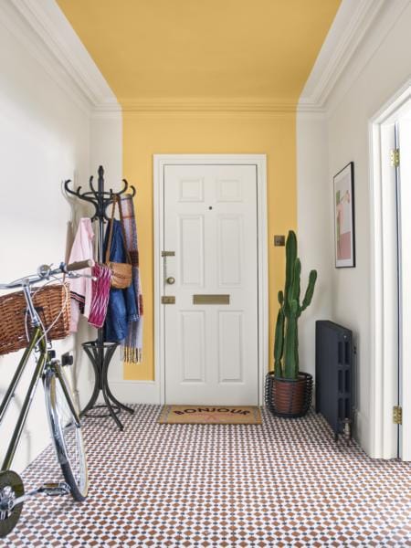 Alternatively, extend your stripe across the entire length of the ceiling, as we’ve done in this bright and breezy hallway. Not only does it make the space feel like it stretches for days – when in fact, it’s quite small and narrow – but painting the stripe in vibrant California Days using Dulux Easycare Washable & Tough makes for a happy entrance as you step through the front door. Creamy Natural Calico on the rest of the ceiling and walls makes the yellow jump for joy while Rich Black on the coat stand adds welcome contrast. With its 2-in-1 formula, using Dulux Simply Refresh Multi-surface meant the paint could be applied directly to the wood for a quick and easy transformation. Bring the outside in with a pot plant or two and add further character with beautiful artwork.