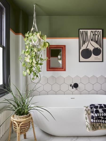 In this bathroom, we’ve painted the ceiling in fresh Guild Green to create a spa-like feeling that’s conducive to relaxation, while providing something calm to look at when soaking in the tub below. To make even more of a splash, we’ve brought the colour part-way down the walls, using tropical Frosted Papaya as a divider line between the serene green and cool Rock Salt beneath. The result is a tranquil space that’s ready for ‘you time’ any time. Better still, because we used Dulux Easycare Bathroom – complete with steam- and moisture-resistant technology – the space will stay looking great for longer. Why not style it up with lush plants and patterned textiles, as we’ve done here, together with natural materials like wicker and stoneware?
