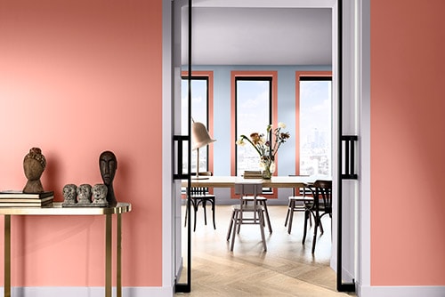 If there’s a corner of your home that you’d like to turn into a dedicated exercise area or yoga studio, opt for warm colours from the Studio palette. Depending on the shades you pick, warm colour schemes can help you escape the everyday as you breathe, stretch and move. In this space, we painted a circle of Blood Orange for a modern and motivating backdrop. And then mellowed the room out with two calming colours, Pressed Petal and White Cotton.