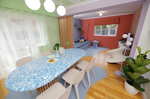 The 2LG team took a different approach to their Italian transformation, they were inspired by the bright shades of gelato. From the striped ceilings to the colourful divide to the unique tabletop, Jordan and Russell injected joy into every element of the room.
