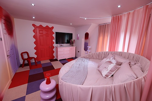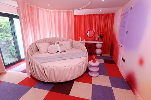 ‘Pucker Up’ was Jordan and Russell’s theme for Donna and Sarah’s bedroom. You’re probably already thinking shades of pink and red, and you’d be right! The boys threw everything into their final look, more so as Donna wanted something eccentric and vibrant to match her personality. 2LG even hand painted red squiggles around the door to add a sense of playfulness to the room.