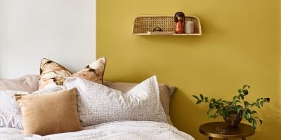 - Create a dynamic oasis with large colour-blocking segments on a captivating feature wall. This style not only complements furniture and accessories but shines as a standout feature on its own.