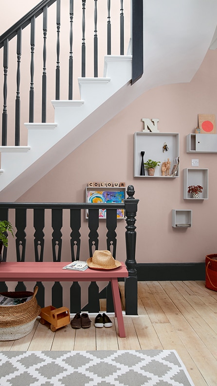 Here, we’ve painted the walls of this hallway in dusky Blush Pink for a whimsical effect, paired with playful Coral Charm on the bench and deep Rich Black on the banister for a contrasting accent. The look is fun and cheerful while feeling grown-up. Painted in Dulux Simply Refresh One Coat, the walls couldn’t have been quicker or easier to transform, while using Dulux Simply Refresh Multi-surface on the woodwork and furniture meant its 2-in-1 technology primed and painted at the same time.