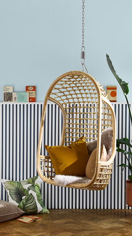 Why not dip in and discover the magic of the Relaxation palette yourself? An ordinary space can be turned into your happy place with a simple lick of paint (swipe to style it up!). We’ve divided the walls of this living room by painting them in a trio of shades from the Relaxation palette. Cloudy Coastal Grey has been used on the back wall for a dreamy background and deep Sapphire Salute has been painted on the wall around the window for a bold but still calming accent. Reinvigorating Polished Pebble has been used on the skirting and door for a complementary flourish. Painting the walls in Dulux Simply Refresh One Coat meant it couldn’t have been be quicker or easier to give them some flair, while using Dulux Simply Refresh Multi-surface to prime and paint the woodwork at the same time was effortless.